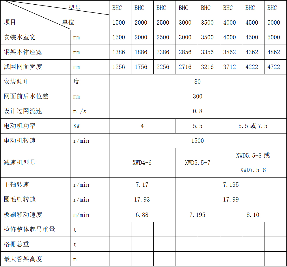 BHC型格柵由支撐鋼架、攔污網篦、板刷、圓毛刷、驅動裝置和傳動裝置等組成。