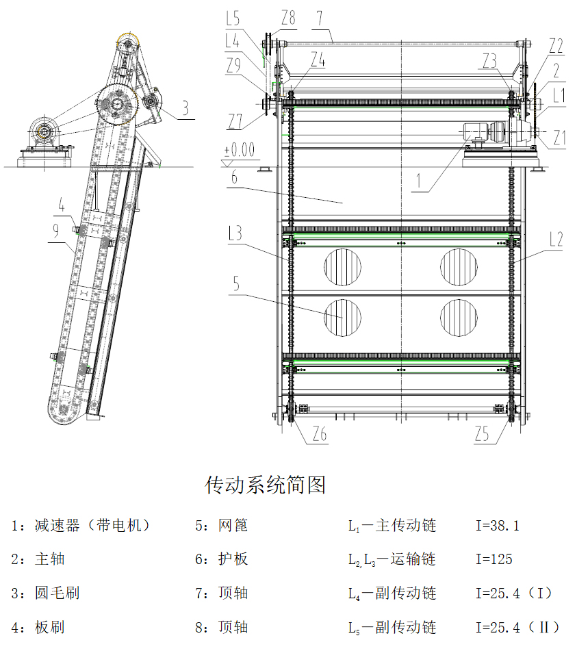格柵的傳動過程見上面的傳動系統簡圖。電源合閘后,電動機、減速機開始傳動,通過傳動裝置上的鏈輪Z1,帶動鏈條L1,再經過Z2帶動主軸3轉動,主軸3使鏈輪Z5、Z4帶動兩根運輸鏈L2、L3移動,Z5、Z6是運輸鏈上的從動輪,它使運輸鏈和板刷作回轉運動。主軸上鏈輪Z7隨主軸轉動帶動付鏈條L4,再經過并列鏈輪Z8帶動付鏈條L5,從而使鏈輪Z9帶動圓毛刷4轉動。當板刷碰撞上圓毛刷時,圓毛刷以頂軸7為中心,逐漸擺開一定距離,再靠重力作用使圓毛刷對板刷產生擠壓,達到清掃板刷上的污物之目的。板刷通過后,它憑重力又自動擺回原位,完成一個清掃動作,被清除的污物掉入沖渣槽內,被水沖走,實現全過程的清污。