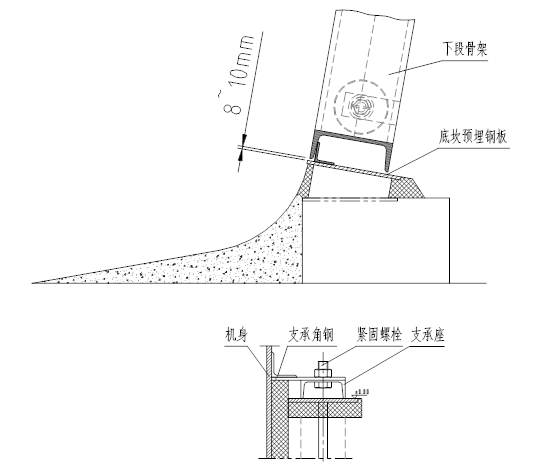 (5)骨架熱膨脹間隙的控制和側翼支承座的灌漿:下圖中下段骨架離底坎予埋鋼板△S=8mm間隙,是考慮骨架在零米層以下較長,安裝閉合氣溫與當地歷年極端氣溫差的熱膨脹量,在施工過程中要嚴格保證。施工時,用δ=8mm厚鋼板放在底坎鋼板上把格柵墊起,按上部和頂部鏈輪軸調整水平。將格柵支承座用螺栓緊固于支承角鋼上,進入預埋坑內灌漿。待沙漿凝固后,提起格柵稍許,抽出所墊鋼板,即保證了8mm間隙。(如下圖)。
