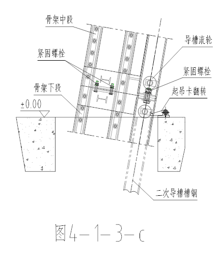 (3)起吊骨架中段:將起吊鋼絲繩系于上部底側槽鋼的吊鉤上,機身吊起,經定位銷,銷座定位后,分段聯接螺栓,使下、中段機身緊固,合為一體,如圖示(圖4-1-3-c)。然后將整機起吊稍許,轉動起吊卡,讓整機沿二次預埋導軌緩慢下滑,至中段末端與地面平齊時,翻轉起吊架,使中段骨架末端處于坑口面上。